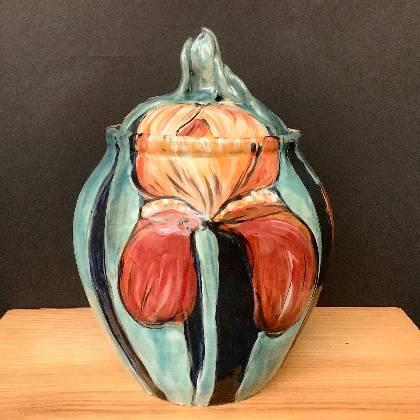 Large Black Ginger Jar with Orange Irises