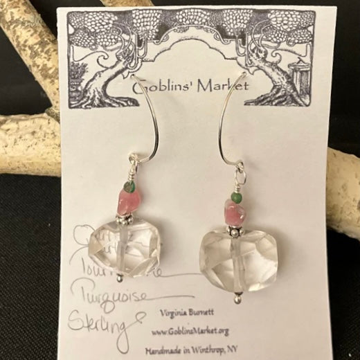 Chunky faceted Quartz nuggets are accented with soft pink Tourmaline pebbles and tiny turquoise spheres. Hand forged sterling silver earwires - Virginia's graceful ear wires are designed for comfort, ease of insertion and stability and allow the gemstone dangles to swing freely while minimizing the possibility of loss.