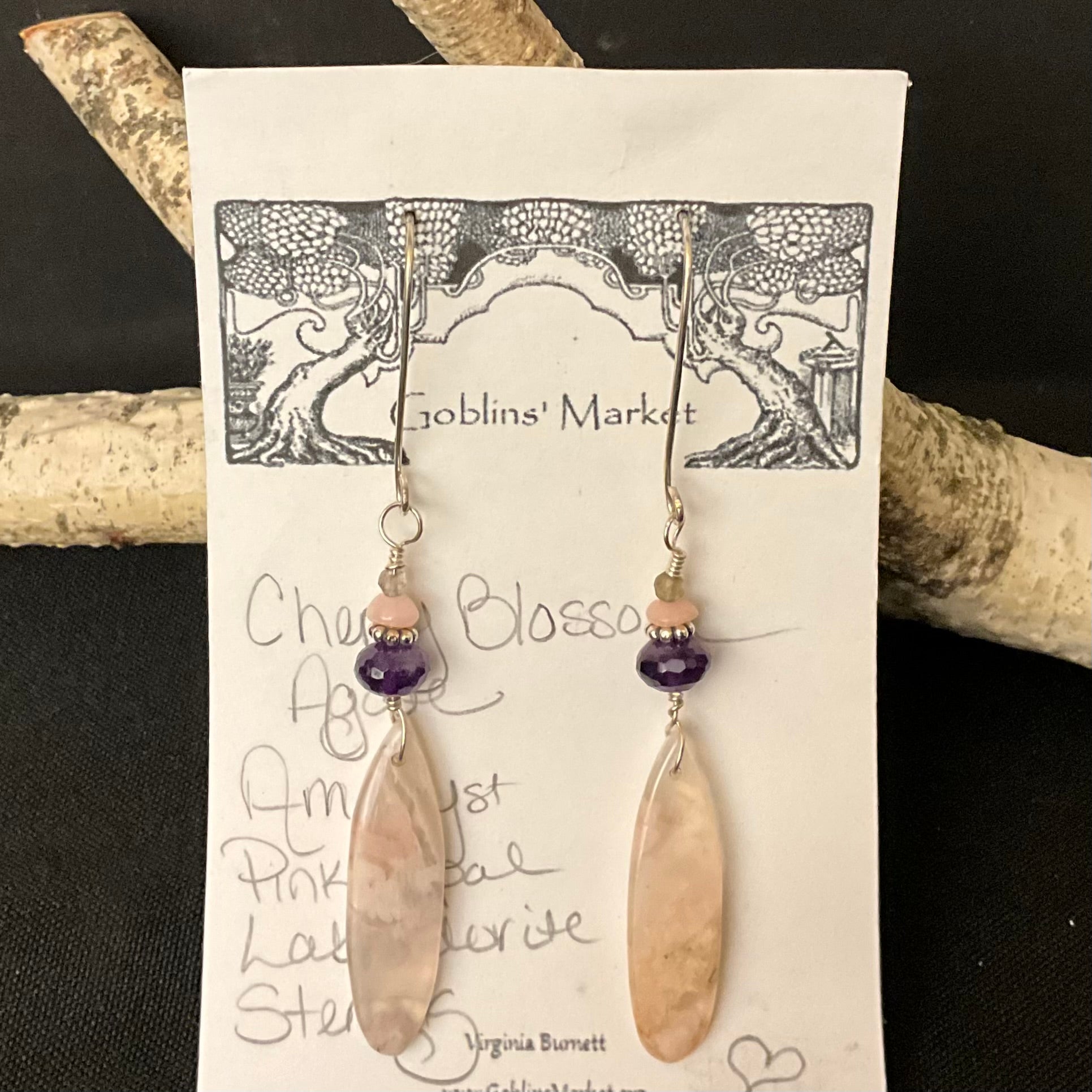 Cherry Blossom Agate Teardrops & Amethyst Earrings