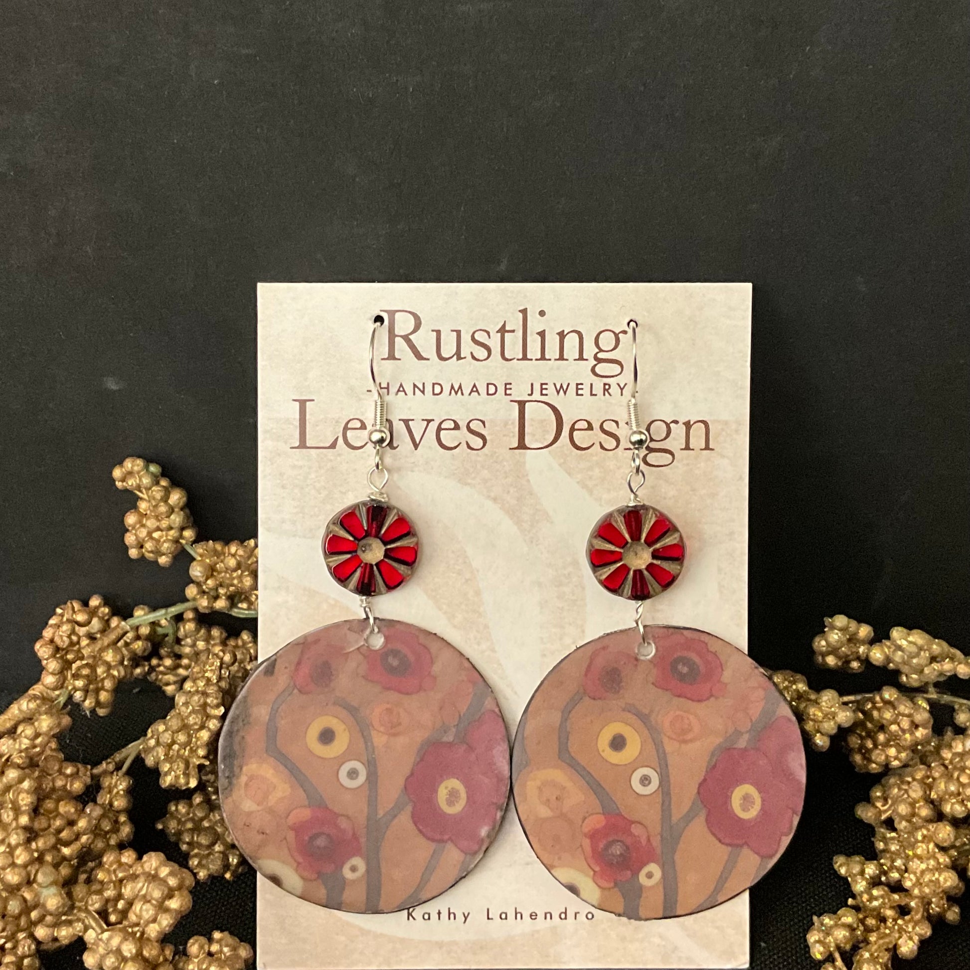 paper & resin circle shaped dangles featuring red & ochre poppies on brown background