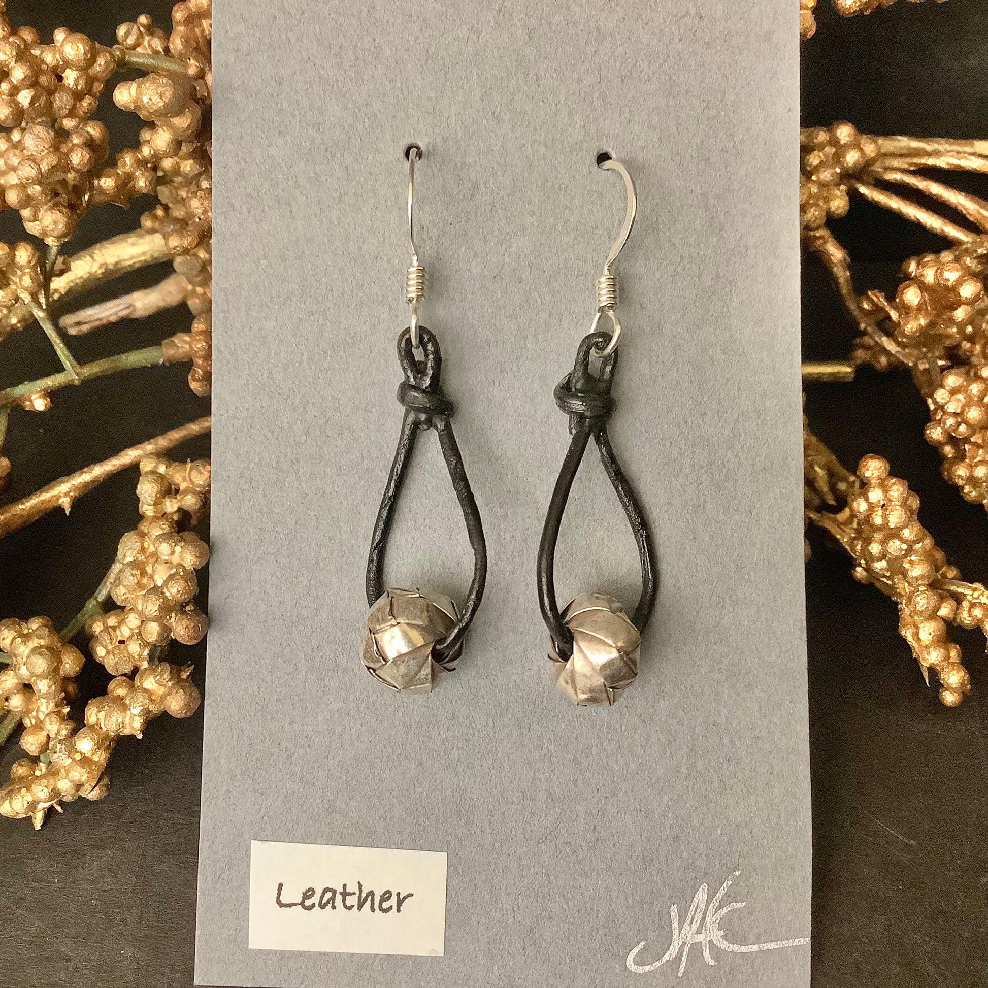 Earrings Black Leather Drop Sterling Woven Beads #232