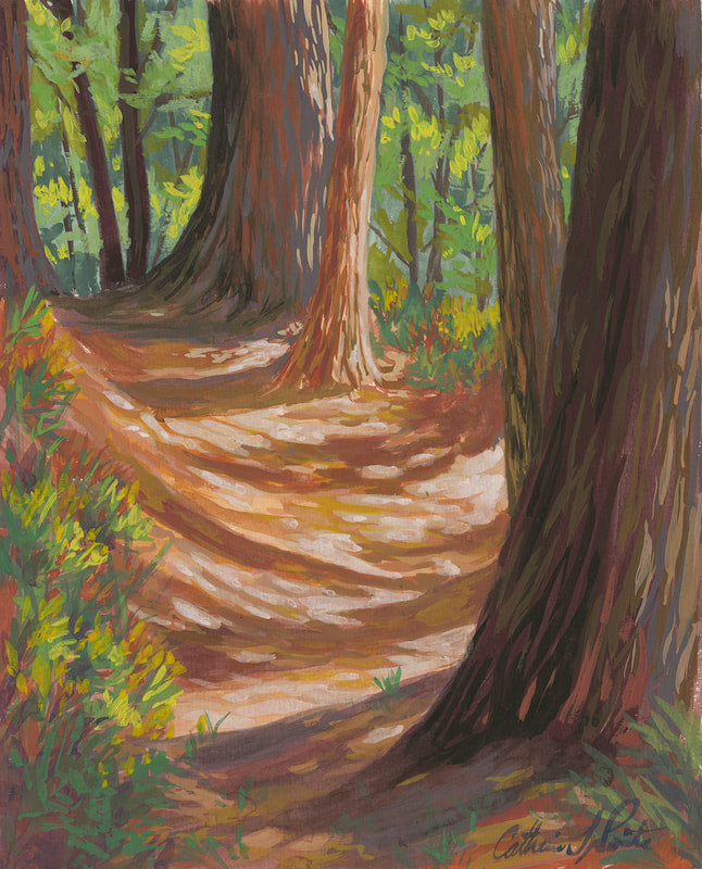 “Cathedral Pines”, Original Plein Air Gouache Painting Matted