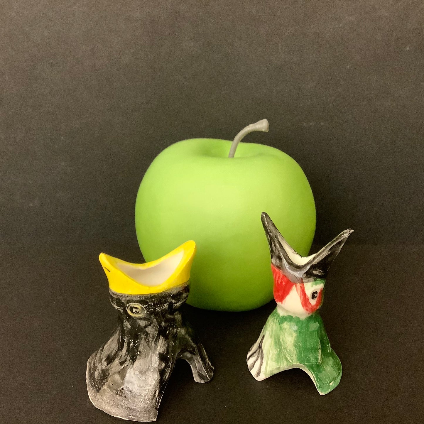 A charming collection of songbirds created by Sara Lynch as functional “pie birds” which indicate when a pie is done by expelling steam through their beaks