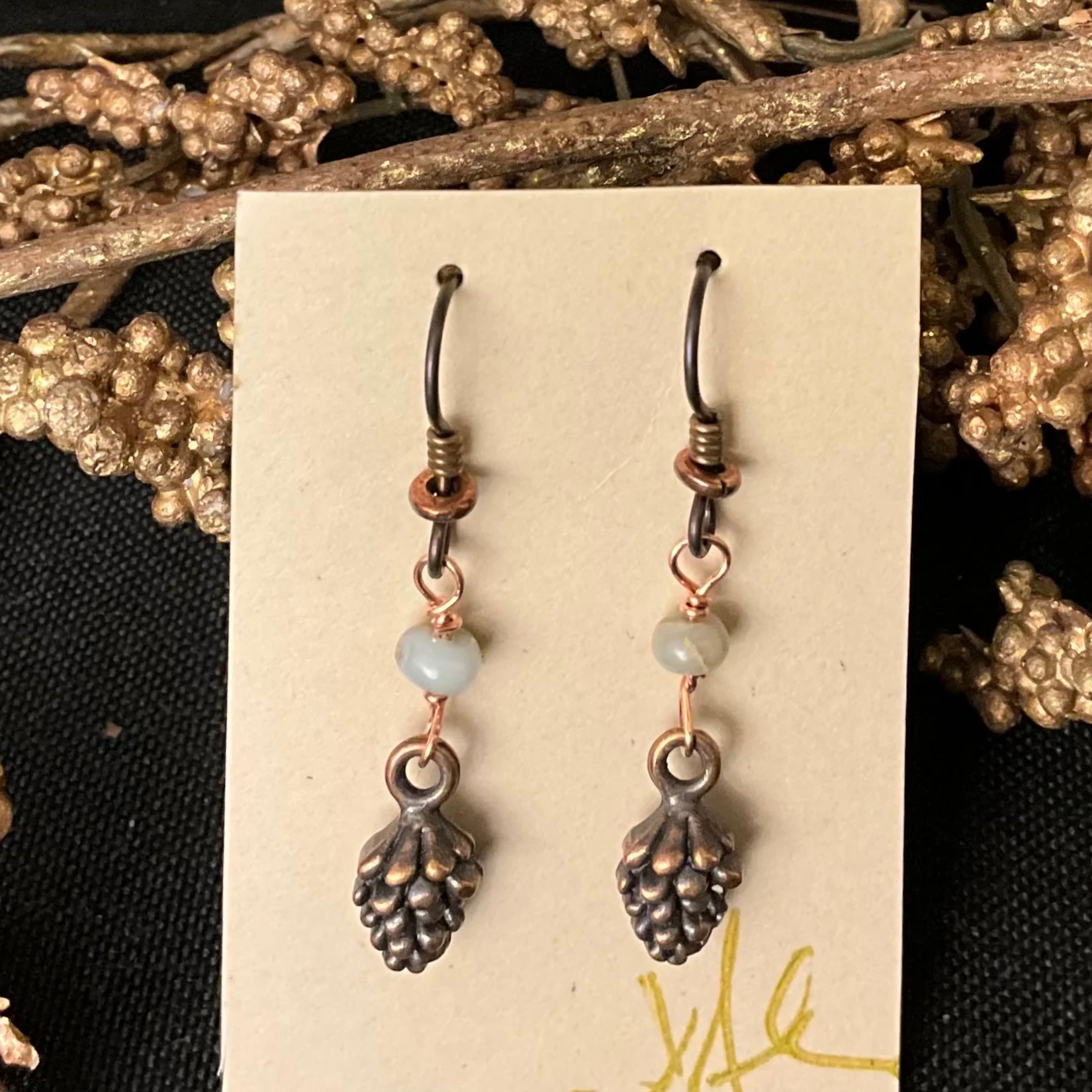 Copper Pinecone Earrings with Serpentine Beads #283