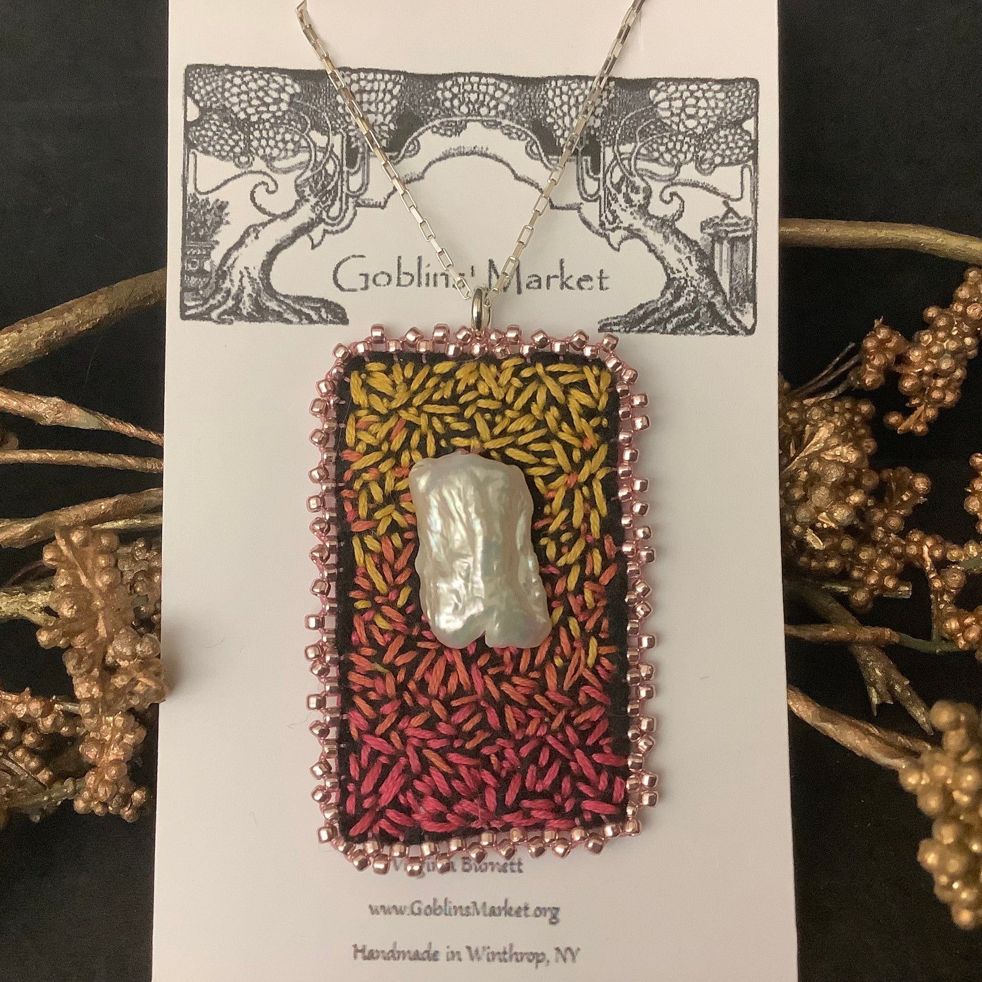 2.25" x 1.25" Embroidered pendant in pinks. orange. yellow with Biwa Pearl bead, 20" sterling box chain