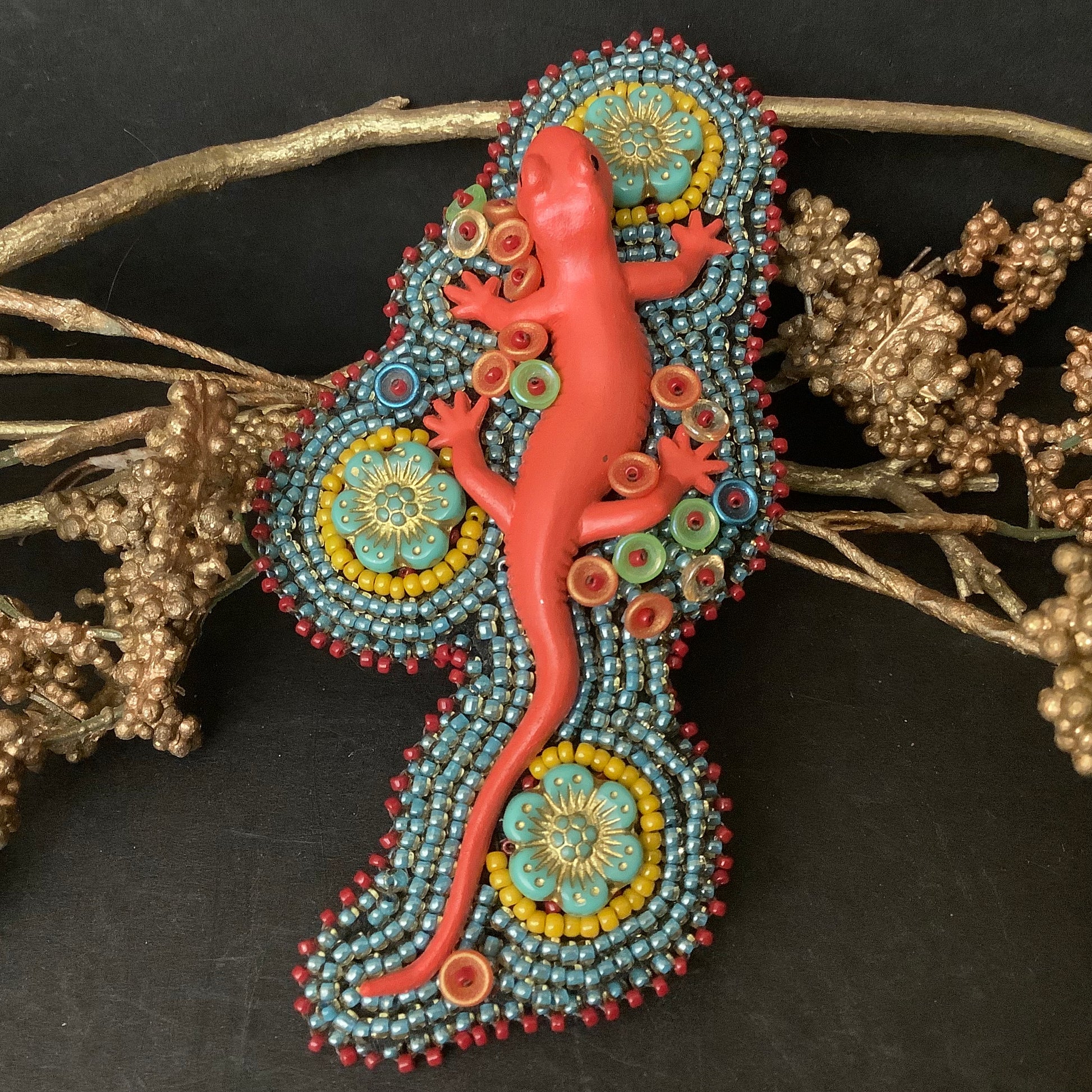 Red Eft Bead Embroidered Pin Salamander & Czech Glass
