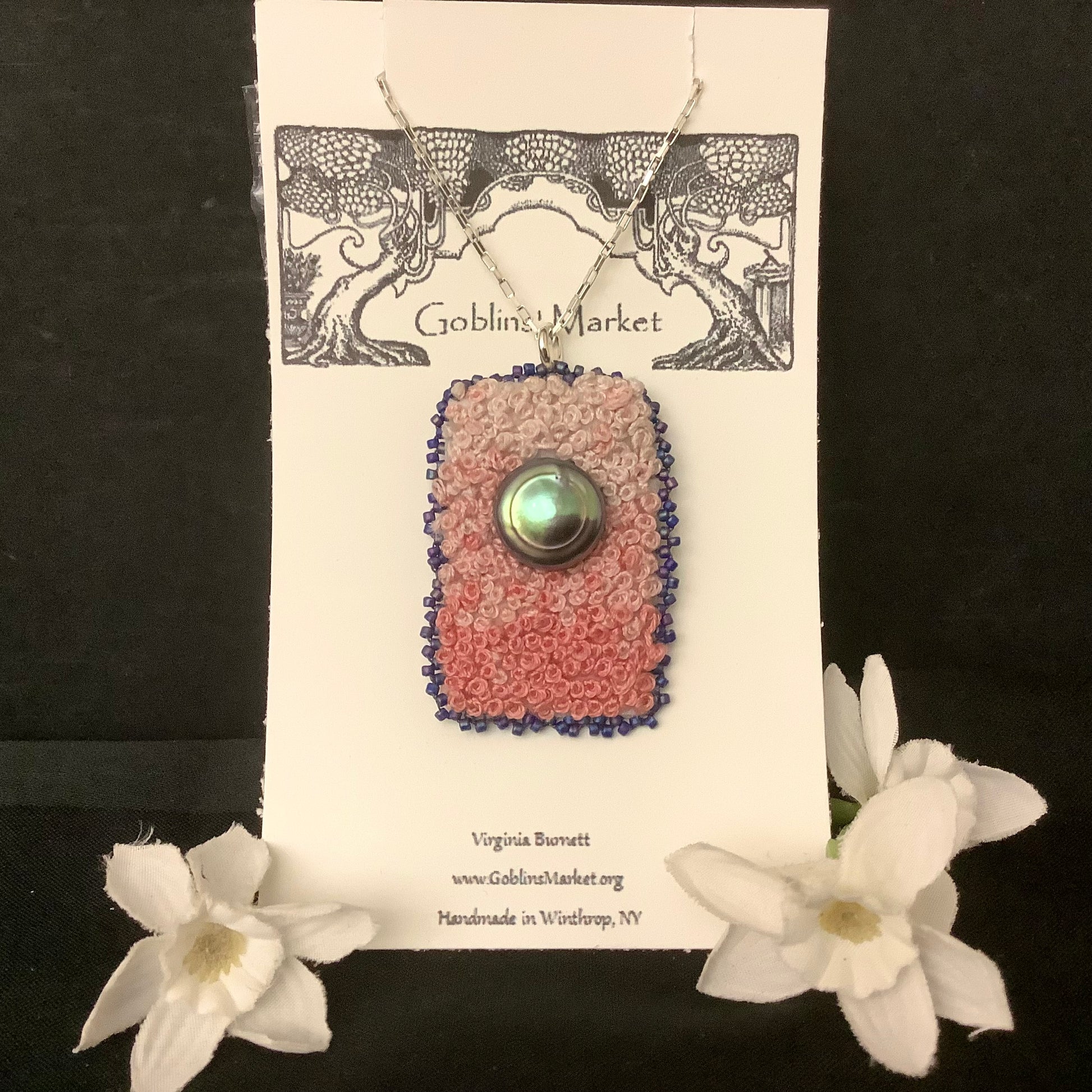 2.25" x 1.25" Embroidered pendant with Iridescent Grey Pearl, 20" sterling box chain