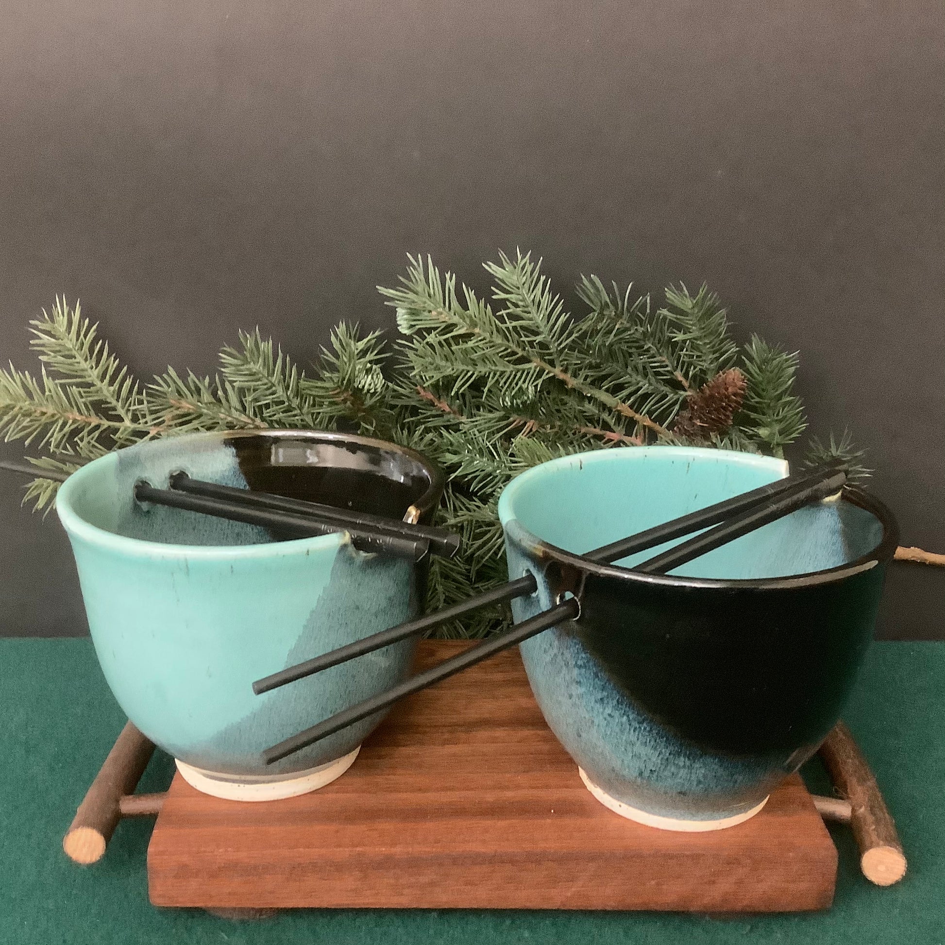 Set of Two Rice Bowls in Black and Turquoise with Chopsticks