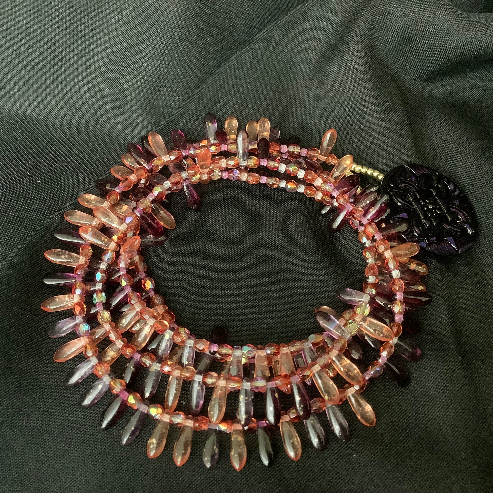Wrap bracelet / necklace in pink & purple dagger drop beads with Large Purple czech glass button clasp