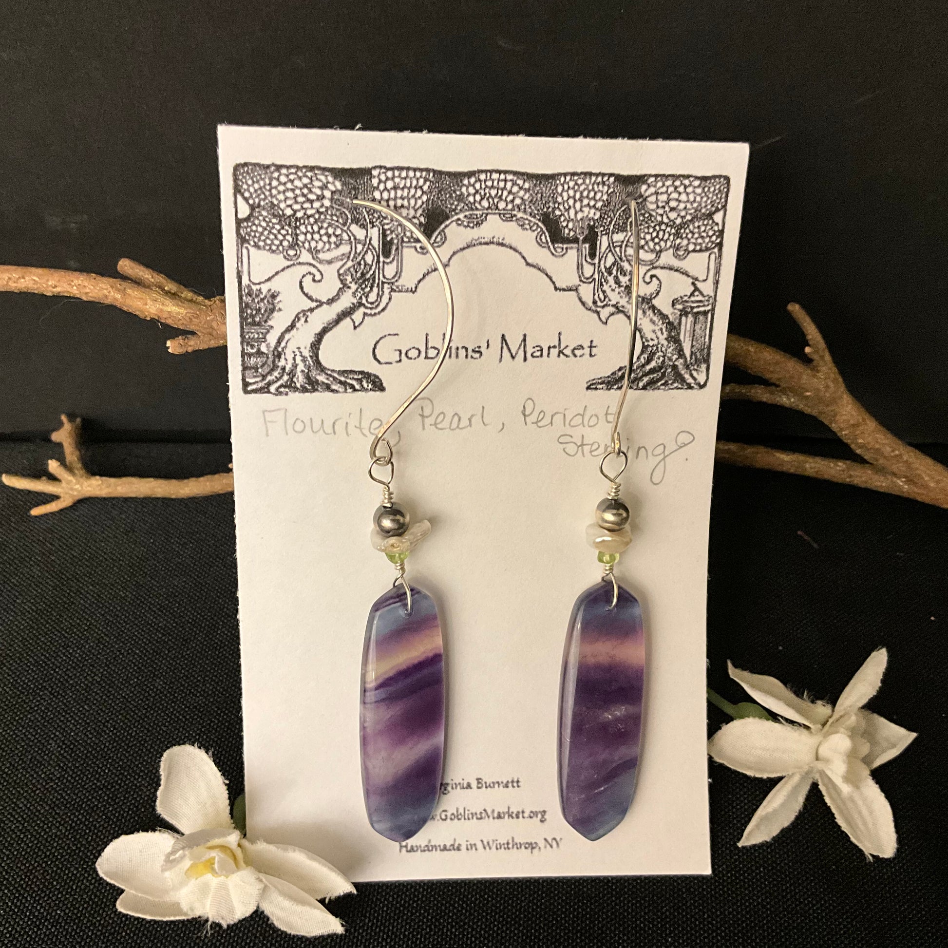 Rich purple & aqua Flourite drops with Sterling Silver, Peridot & Pearl accents dangle from Virginia's signature hand forged earwires. Virginia's semi-precious gemstone jewelry items are designed to be heirloom pieces. All components are genuine gems with solid silver and/or copper metals that can be polished to stay bright through the years. No plated components are ever used.