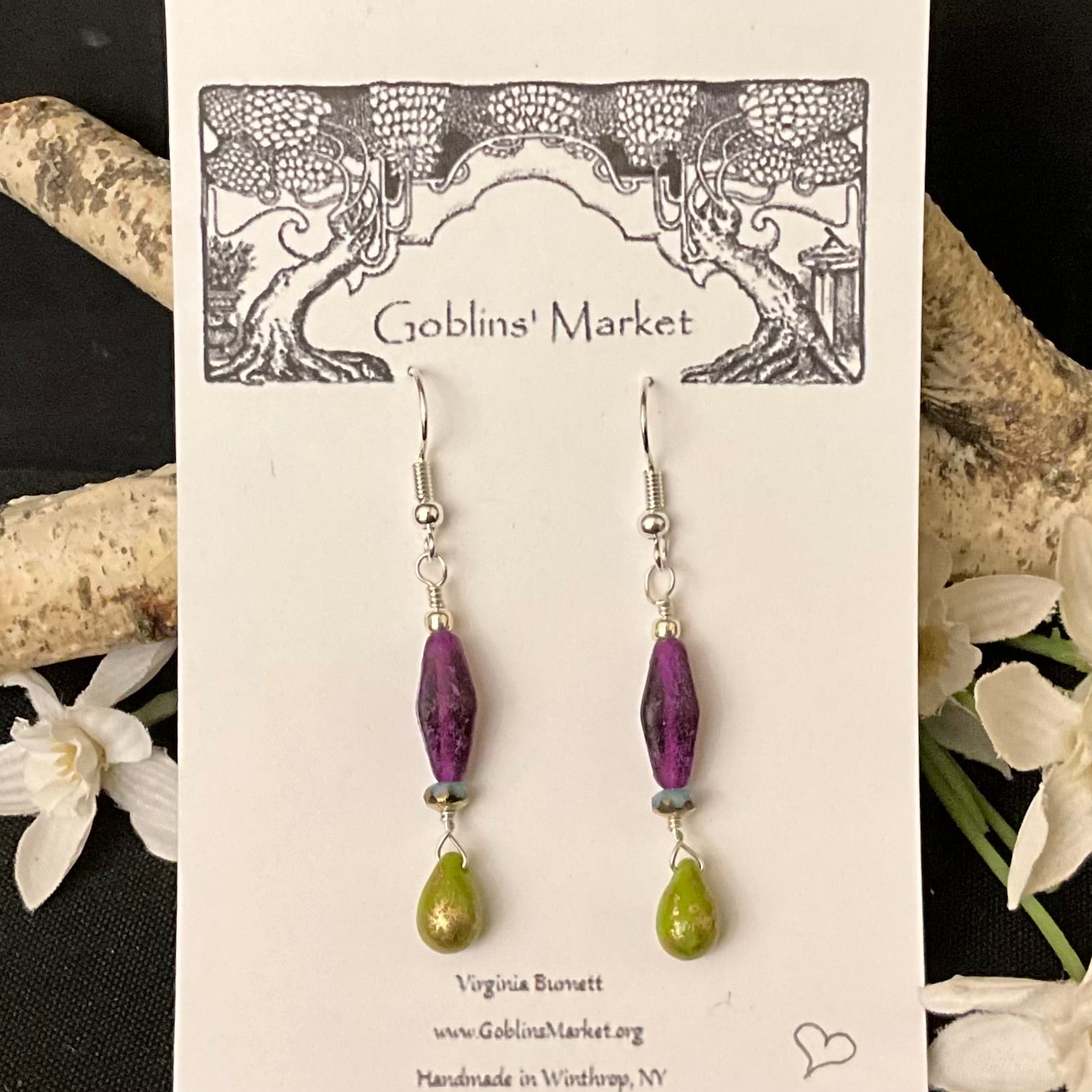 Earrings with Purple Drop and Gilded Lime Teardrop