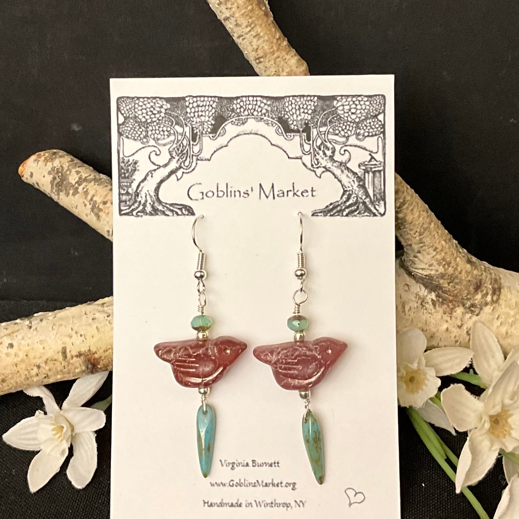 Rosewood Pink Bird earrings with Turquoise Thorn beads