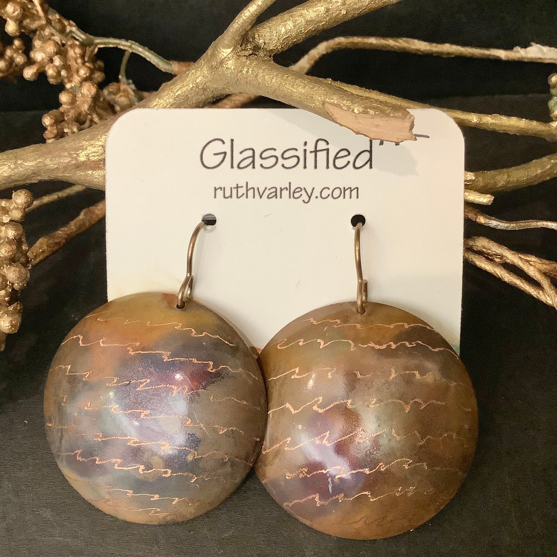 Flame Copper Disc Earrings Squiggles Blue Tones