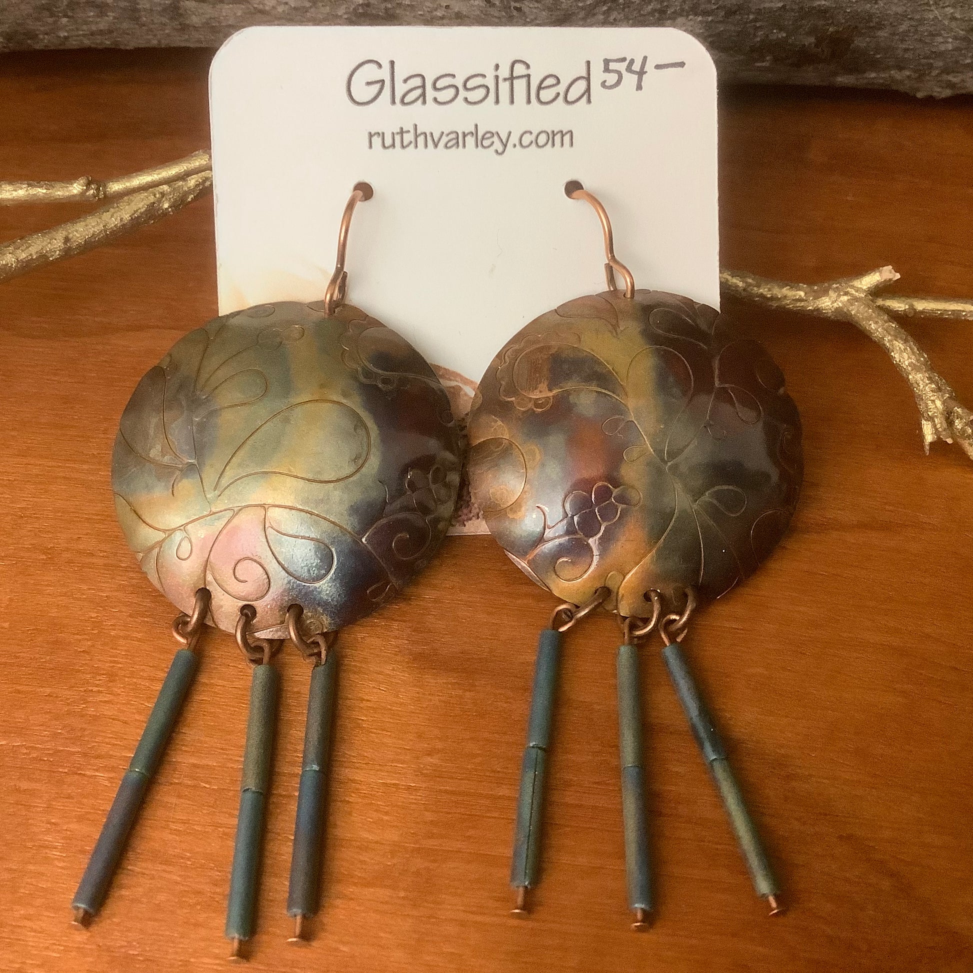 Copper Paisley Embossed Earrings with Blue Bead Fringe