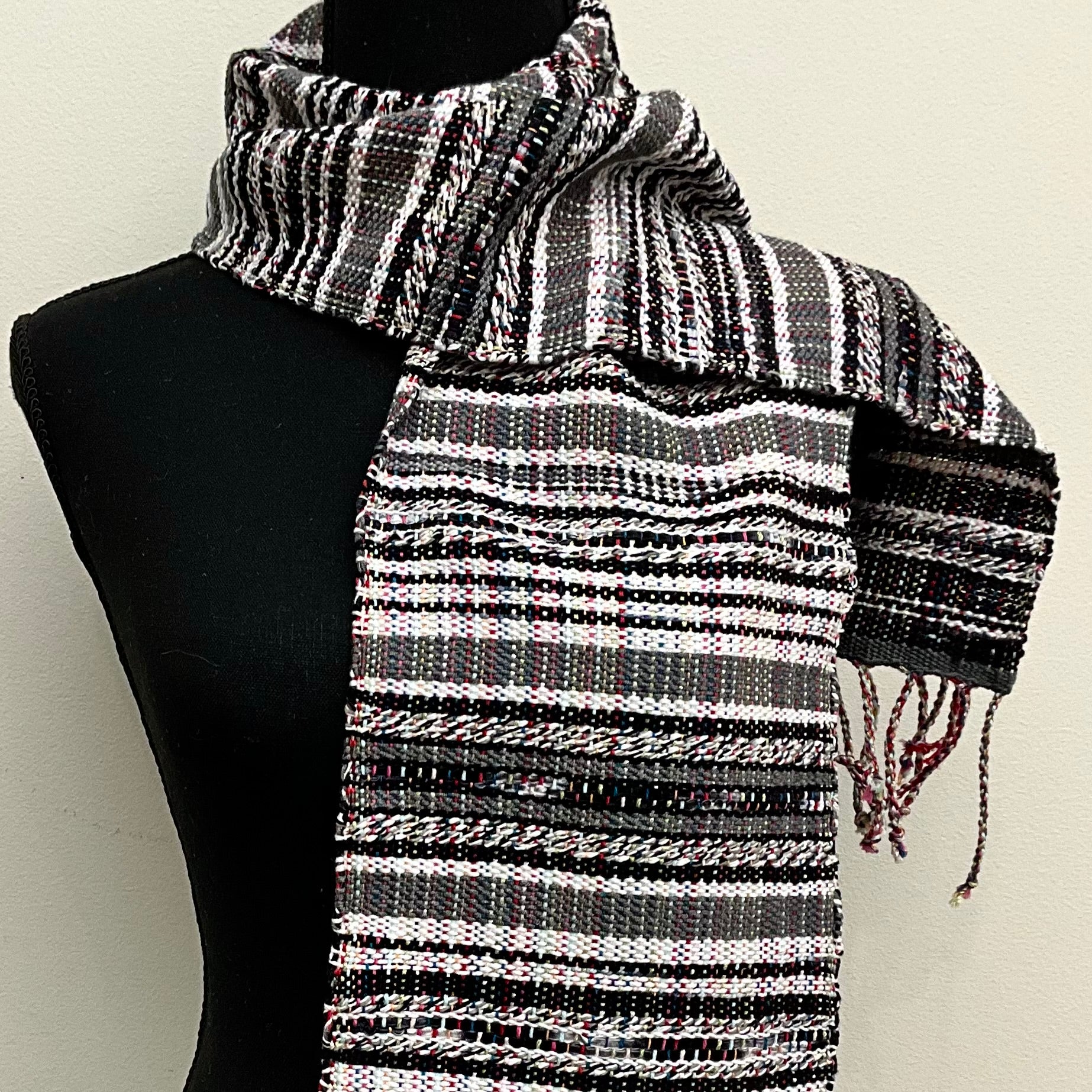 Handwoven “Nora” Scarf N160 Gray, Black, and White