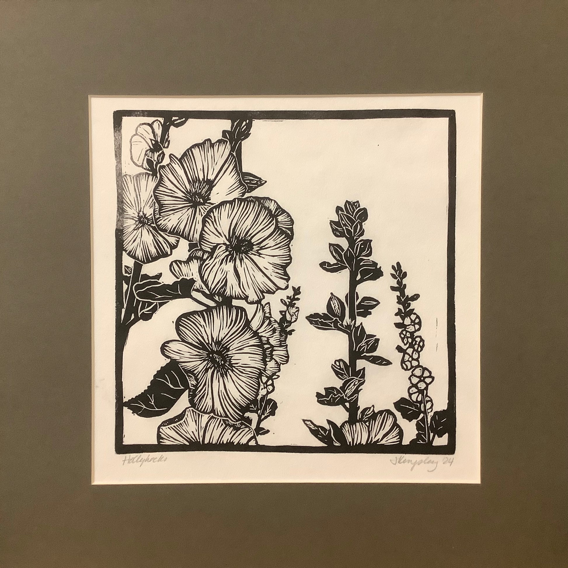 “Hollyhocks” Rubber Block Print with Charcoal Mat