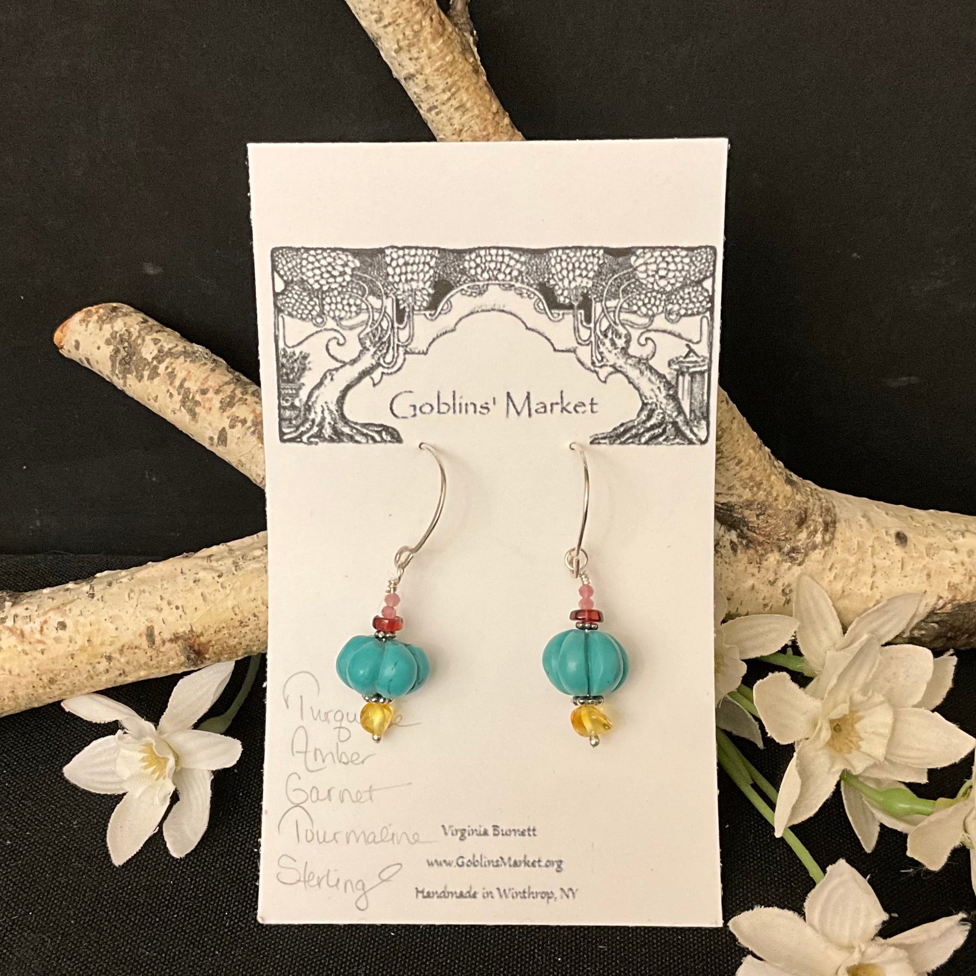 Vintage Turquoise melon beads are paired with Amber, Garnet and Tourmaline accent beads in this set of earrings. Hand forged sterling silver earwires - Virginia's graceful ear wires are designed for comfort, ease of insertion and stability and allow the gemstone dangles to swing freely while minimizing the possibility of loss.