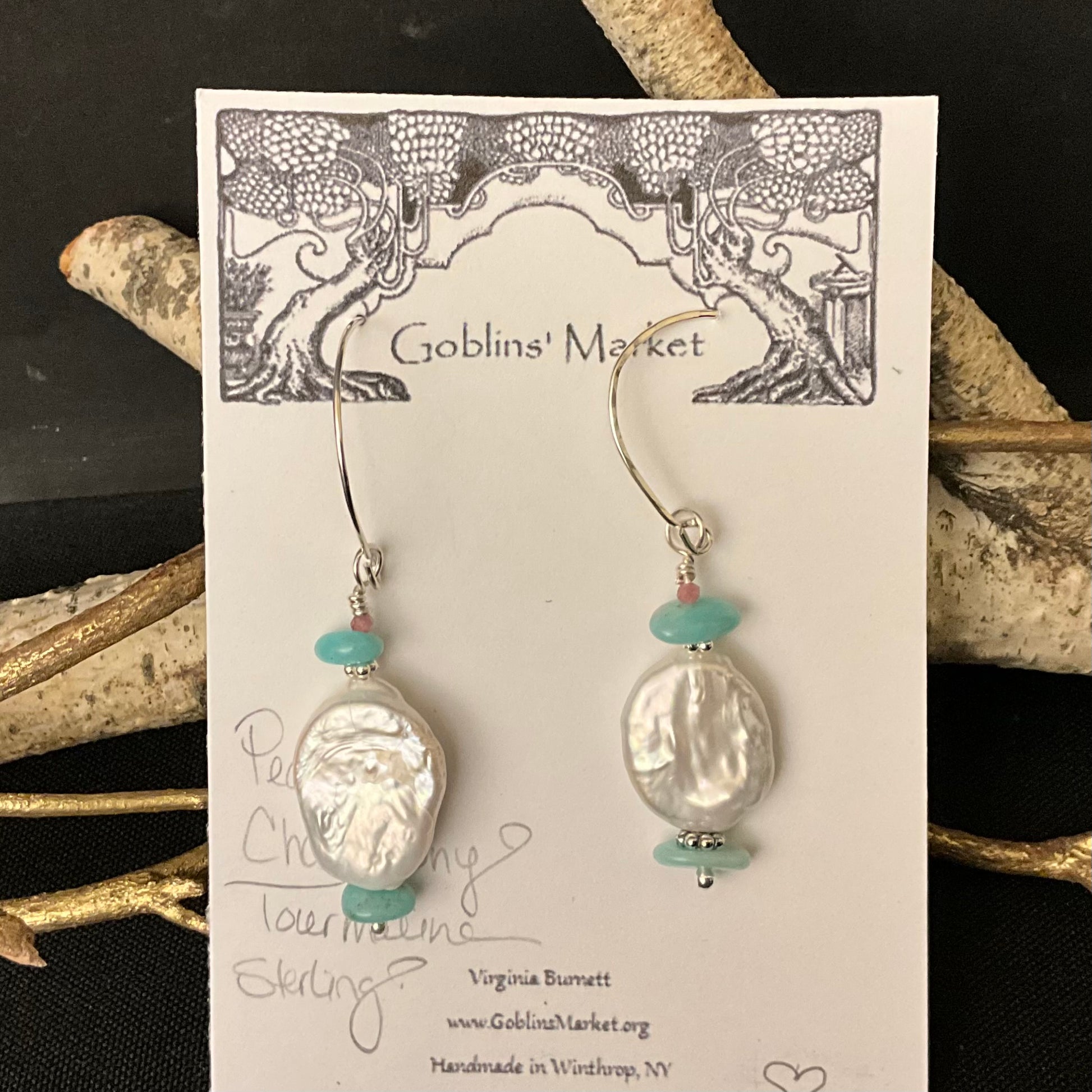 Blue Chalcedony and white oval pearls. Hand forged sterling silver earwires - Virginia's graceful ear wires are designed for comfort, ease of insertion and stability and allow the gemstone dangles to swing freely while minimizing the possibility of loss.