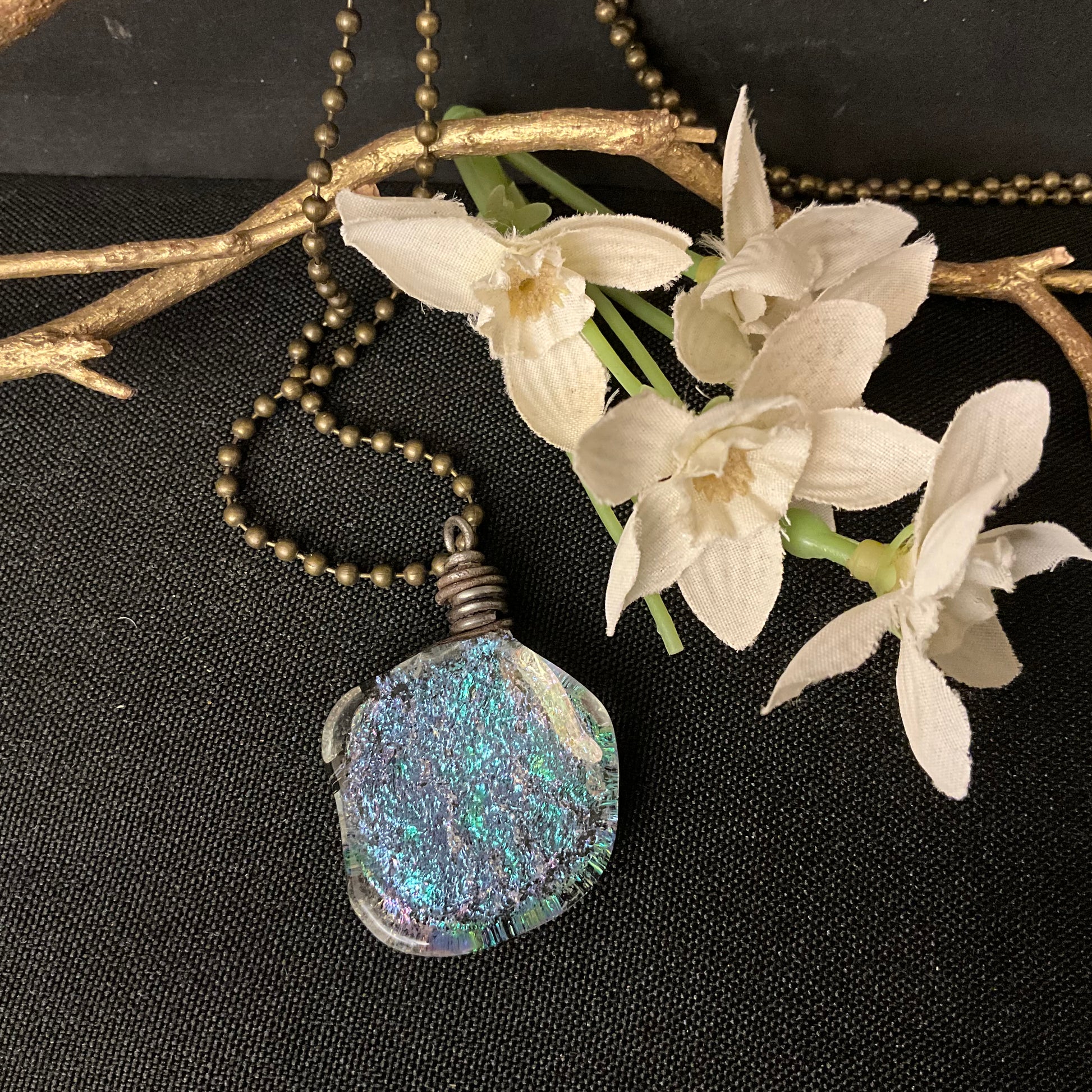 1" x 1.5" dichroic glass circular pendant with iridescent purple/green micro glitter in clear glass
