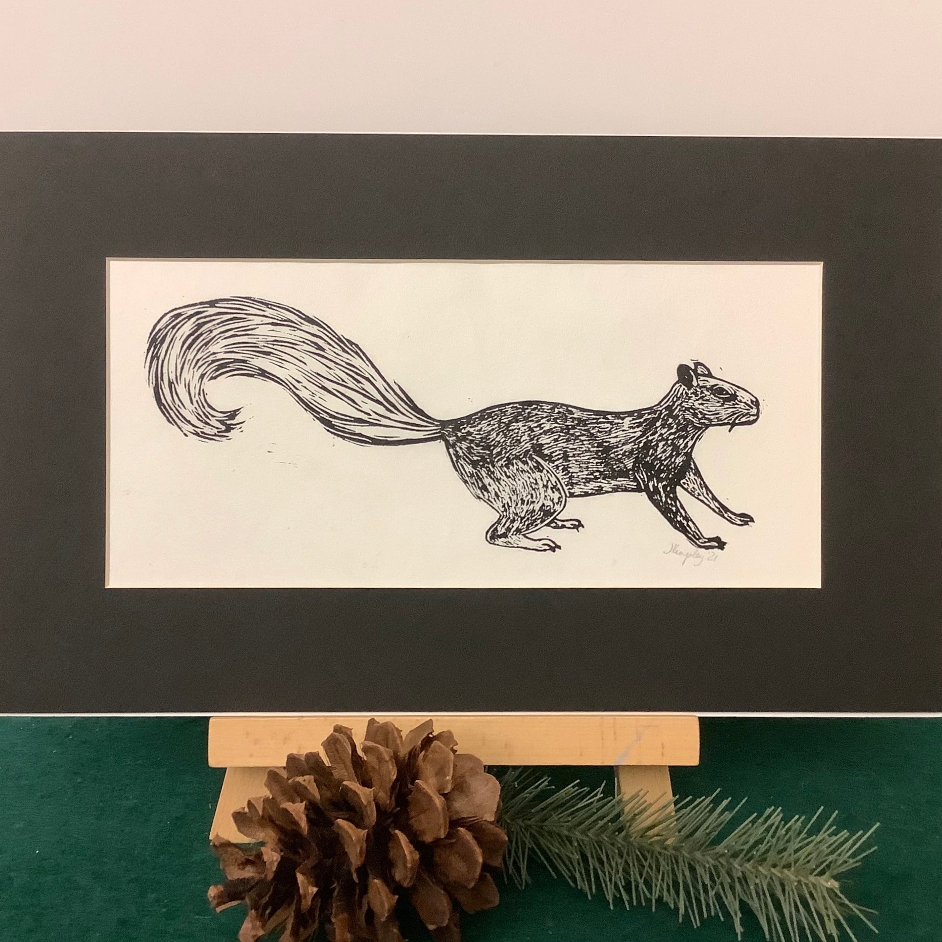 “Paused Squirrel” Rubber Block Print with Black Mat
