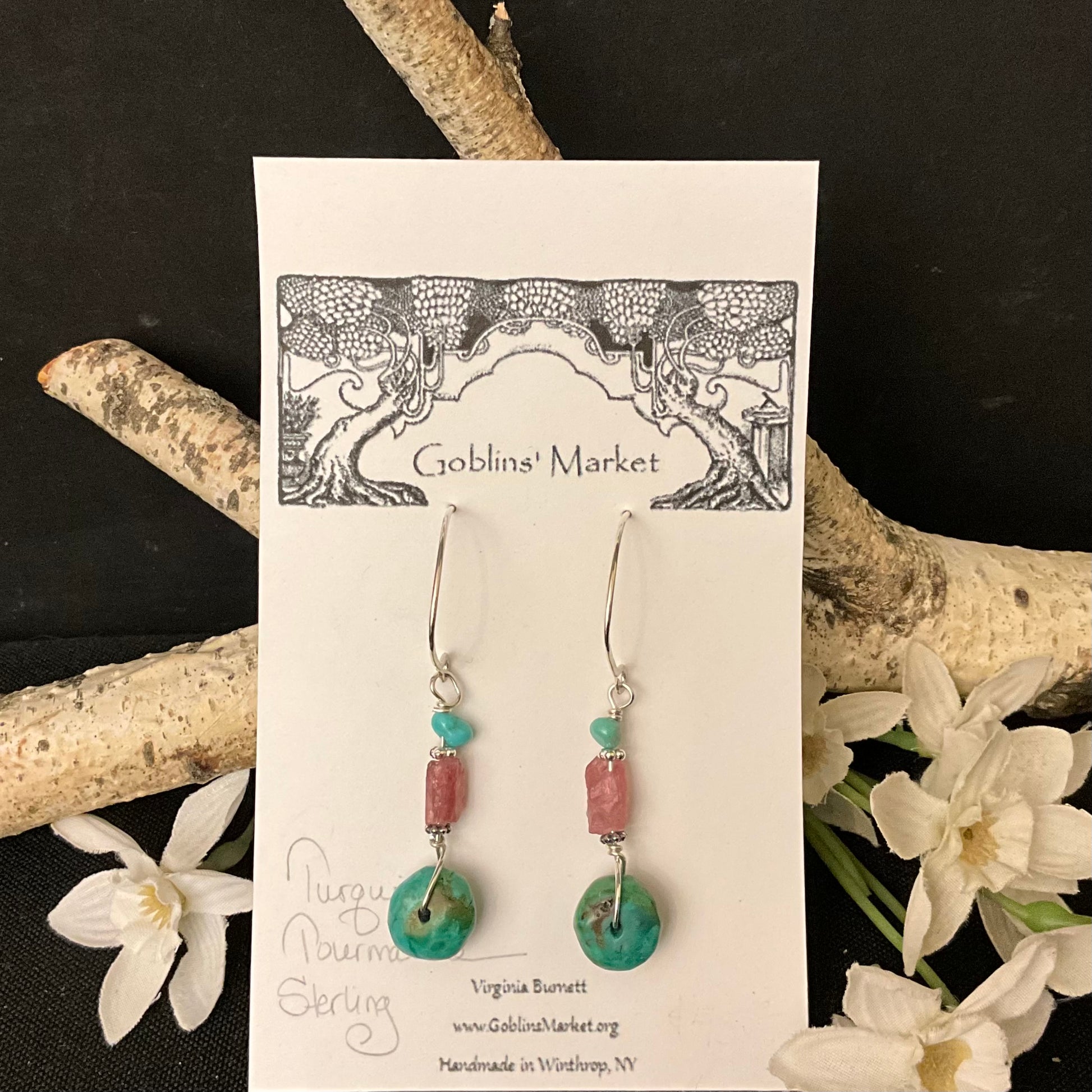 Rich blue Turquoise and Pink Tourmaline dangle earrings . Hand forged sterling silver earwires - Virginia's graceful ear wires are designed for comfort, ease of insertion and stability and allow the gemstone dangles to swing freely while minimizing the possibility of loss.
