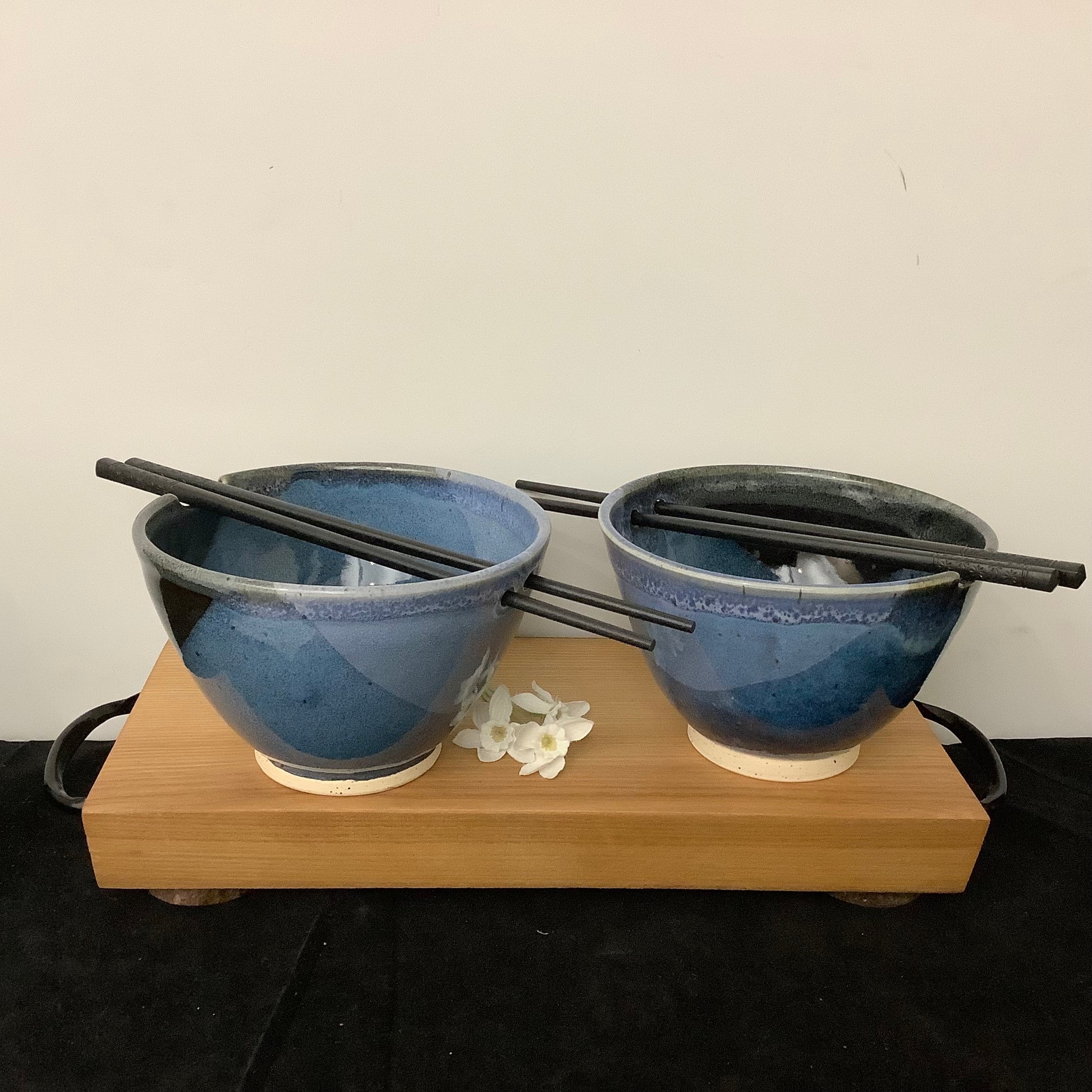Set of Two Rice Bowls in Blue and Midnight Black with Chopsticks