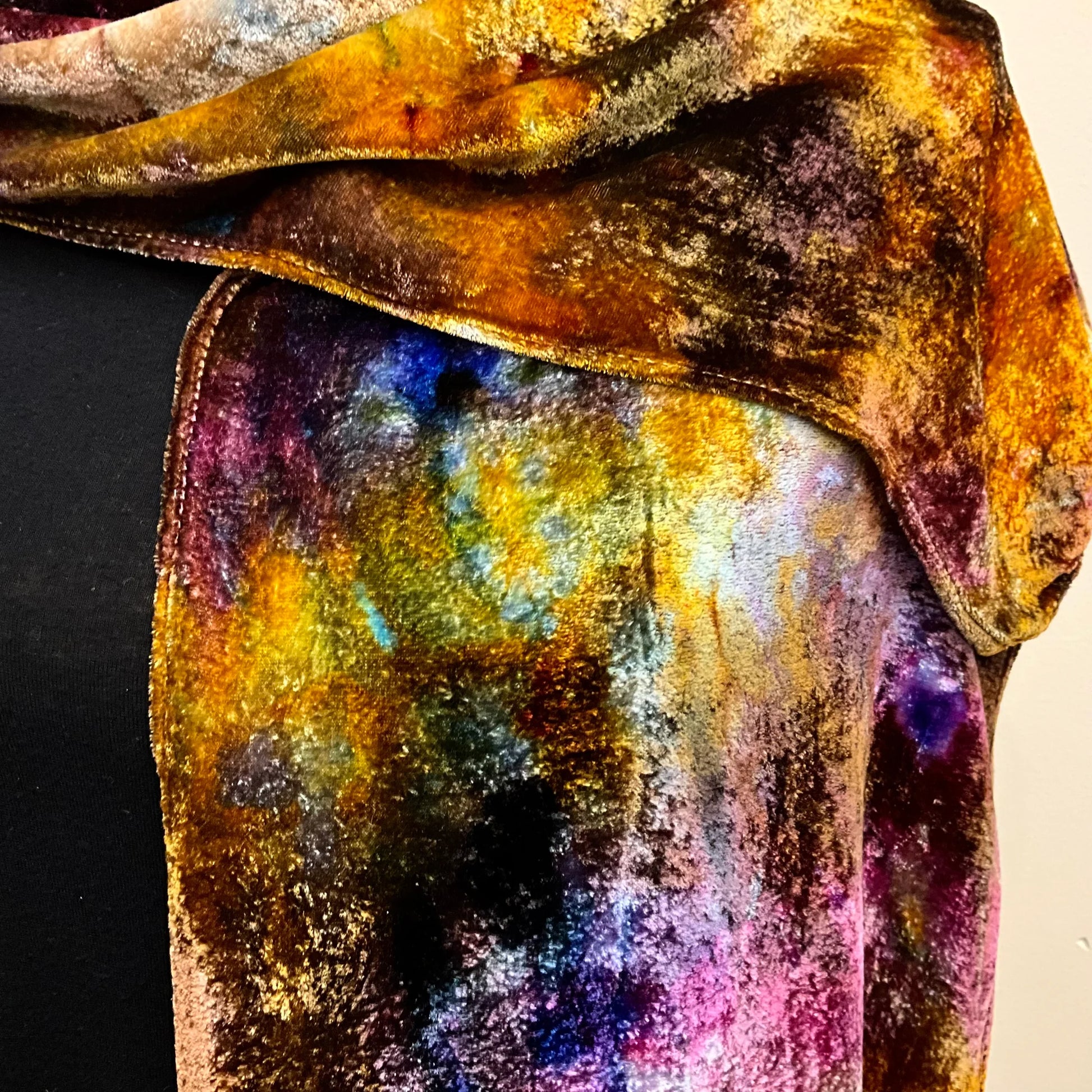 Autumn Blues features classic autumn tones accented with soft and smoky denim blues & greys. On velvet, these colors become especially deep, rich and vibrant with a shimmering, iridescent effect thanks to the lush pile of the fabric. These scarves are heirloom quality and will last decades if cared for properly. Each scarf is unique, even when dyed in the same colorway and same batch.