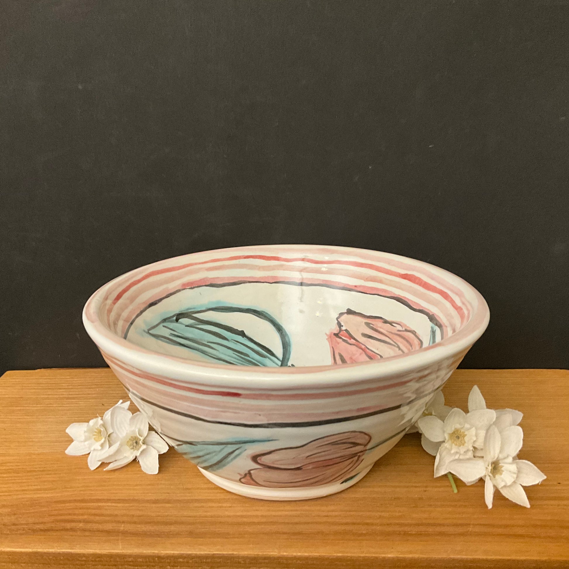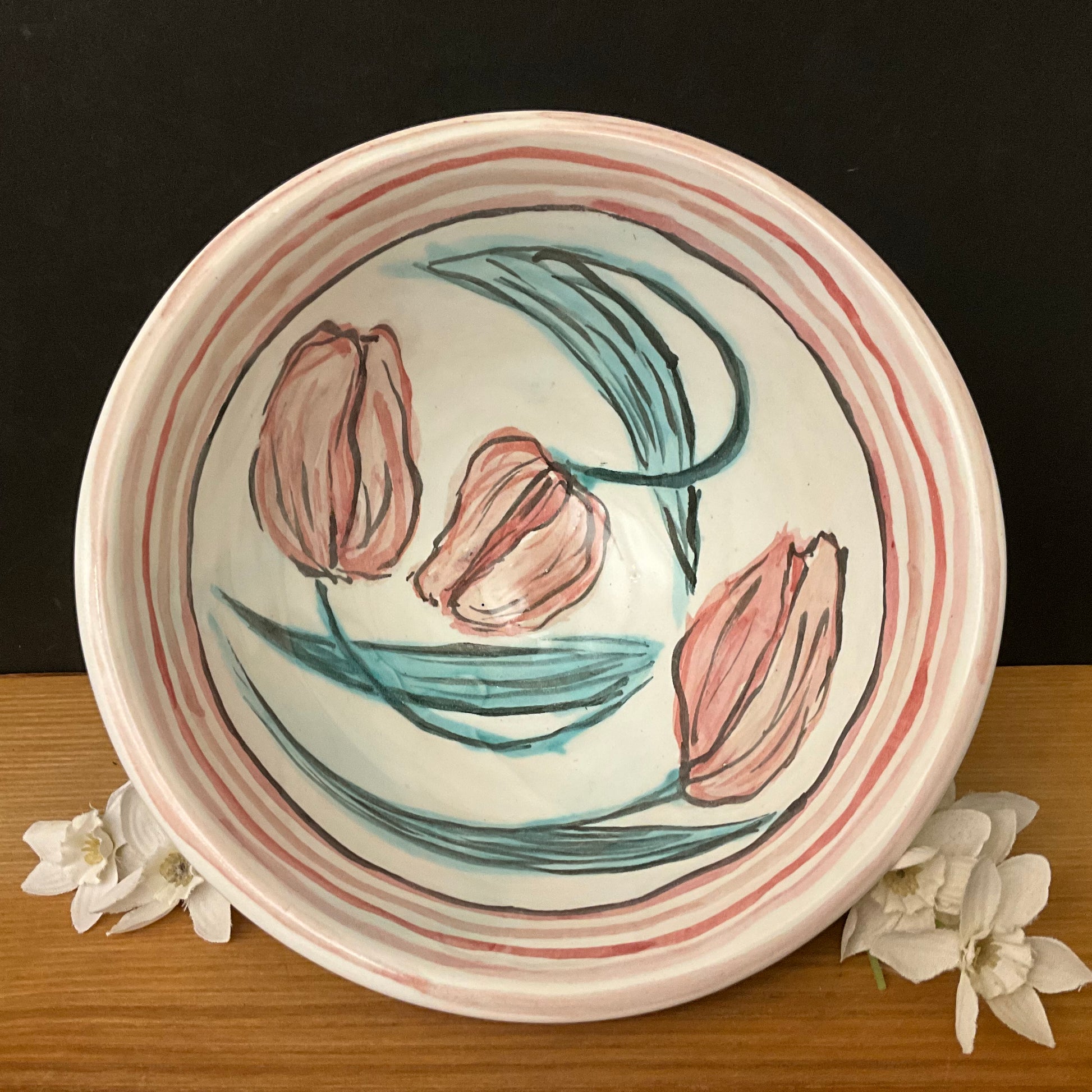 Small White Bowl with Pale Watercolor Look Pink Tulips