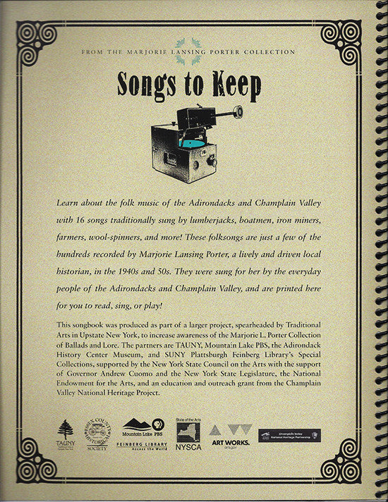This 40-page book of 16 Adirondack North Country songs from the Marjorie Lansing Porter. Spiral Bound.