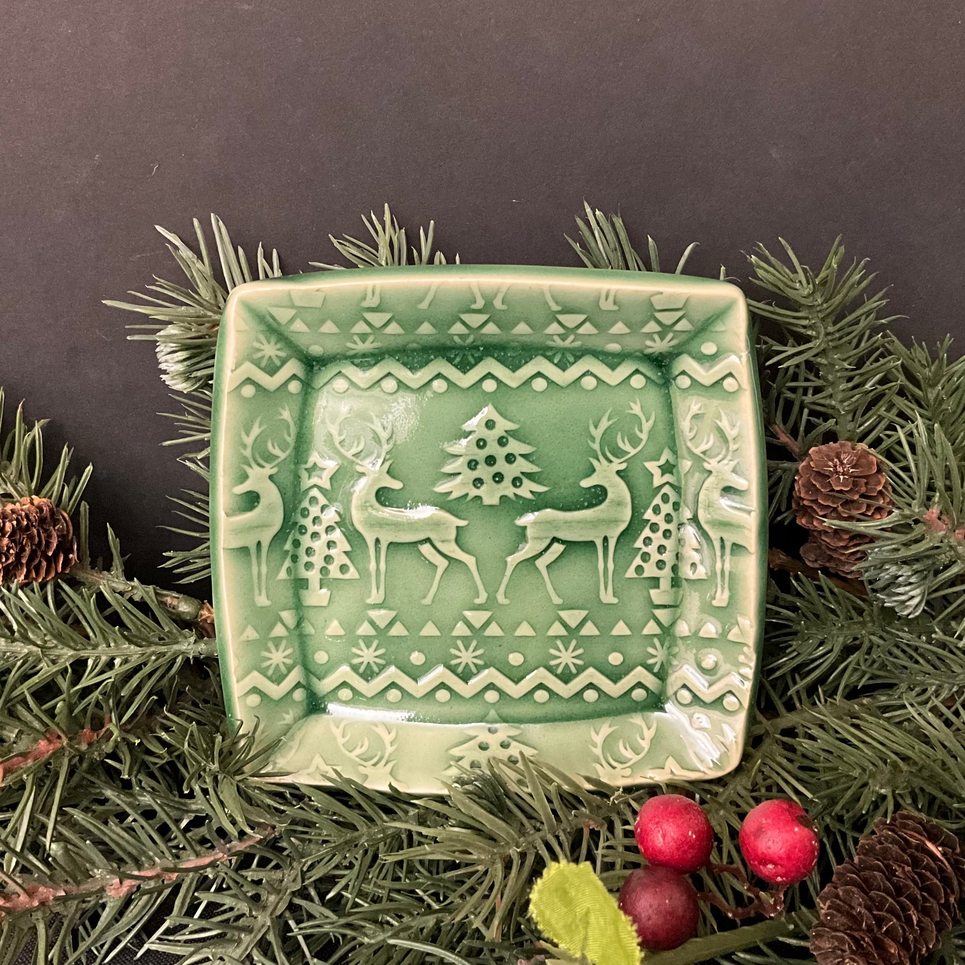 Square Trinket or Soap Dish Green Reindeer & Tree
