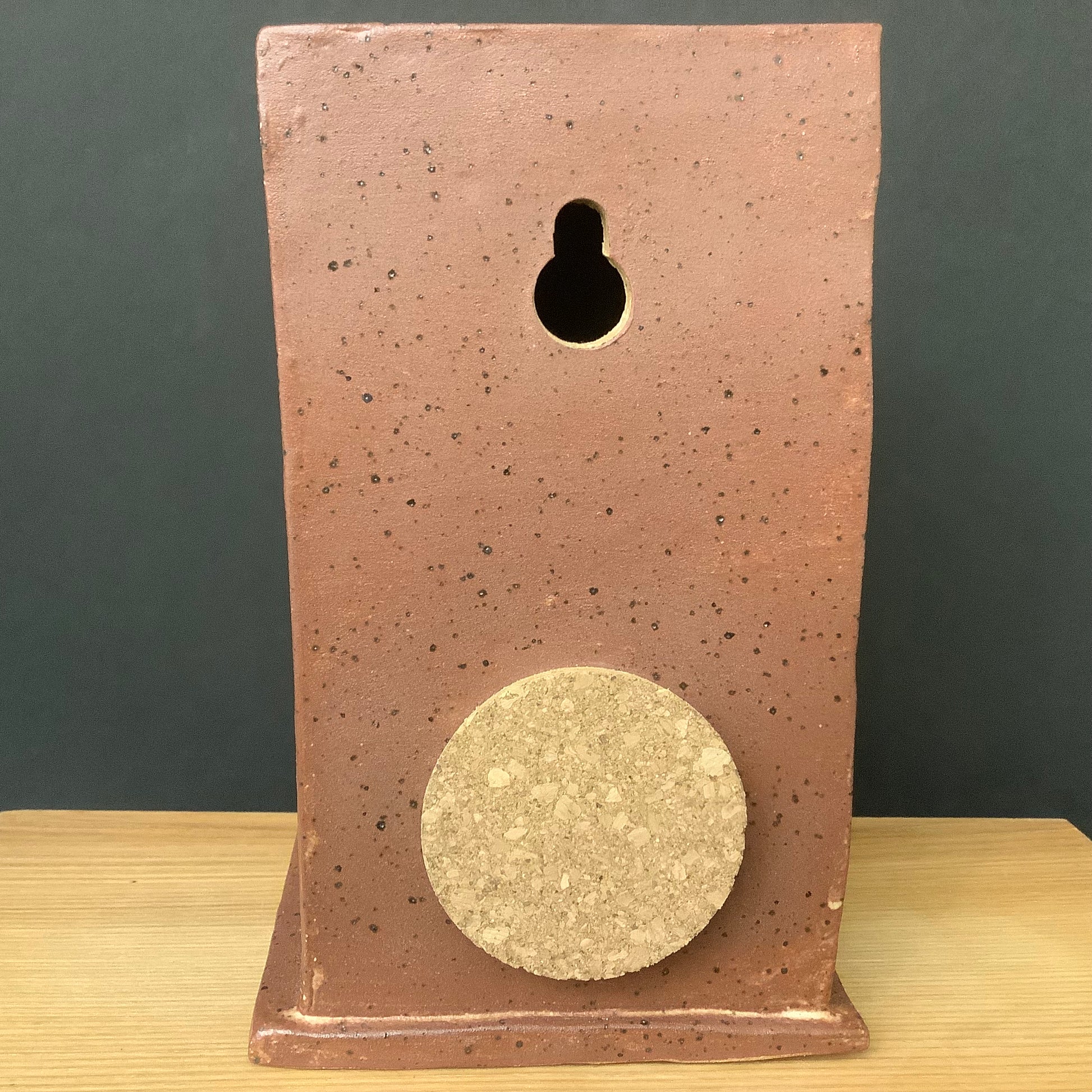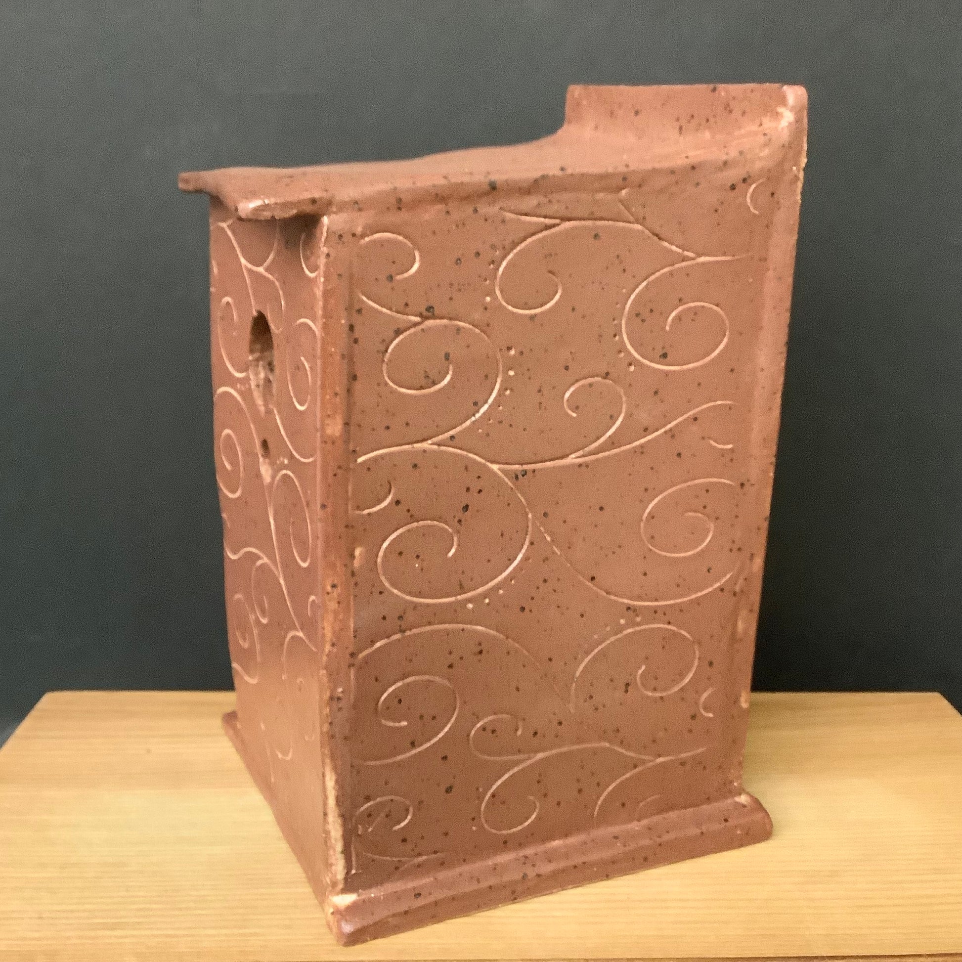 Stoneware birdhouse with back opening for easy cleanout. Glazed in speckled brown with incised swirling vine pattern.