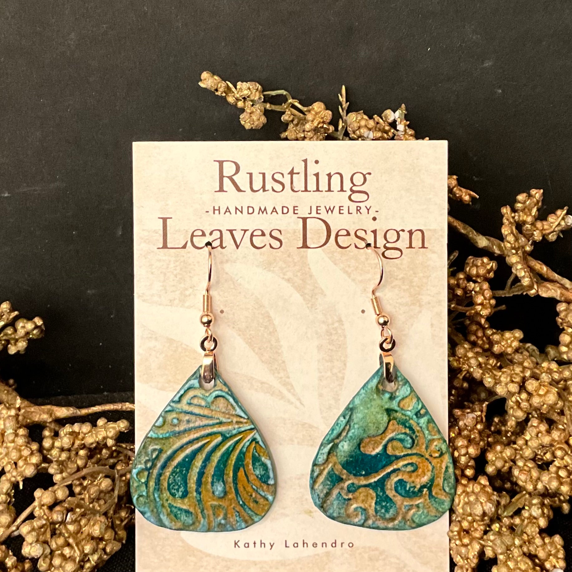 Teardrop Earrings in Greens and Gold Embossed Design