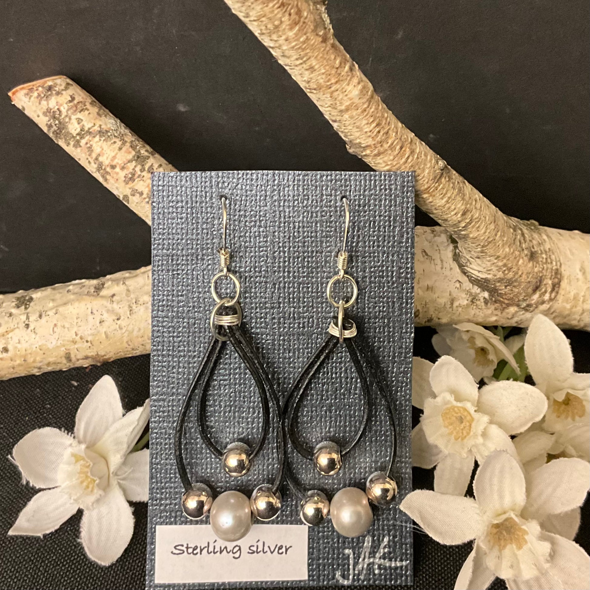 Leather Drop Earrings w/ sterling & pearl beads #234