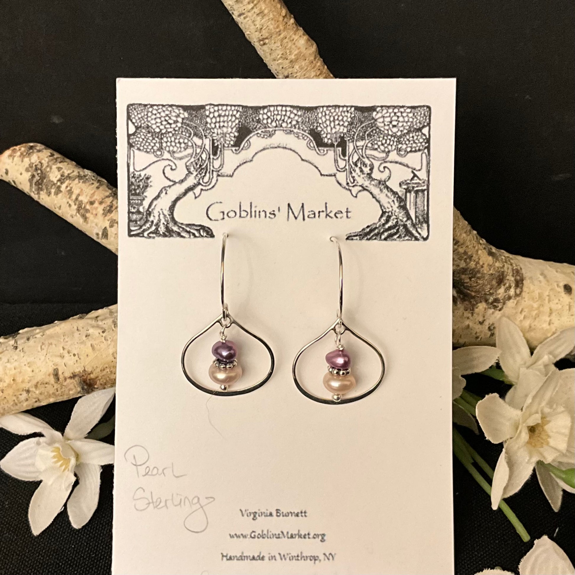 Pink and Purple Button pearls are framed by a Sterling Silver droplet . Hand forged sterling silver earwires - Virginia's graceful ear wires are designed for comfort, ease of insertion and stability and allow the gemstone dangles to swing freely while minimizing the possibility of loss.