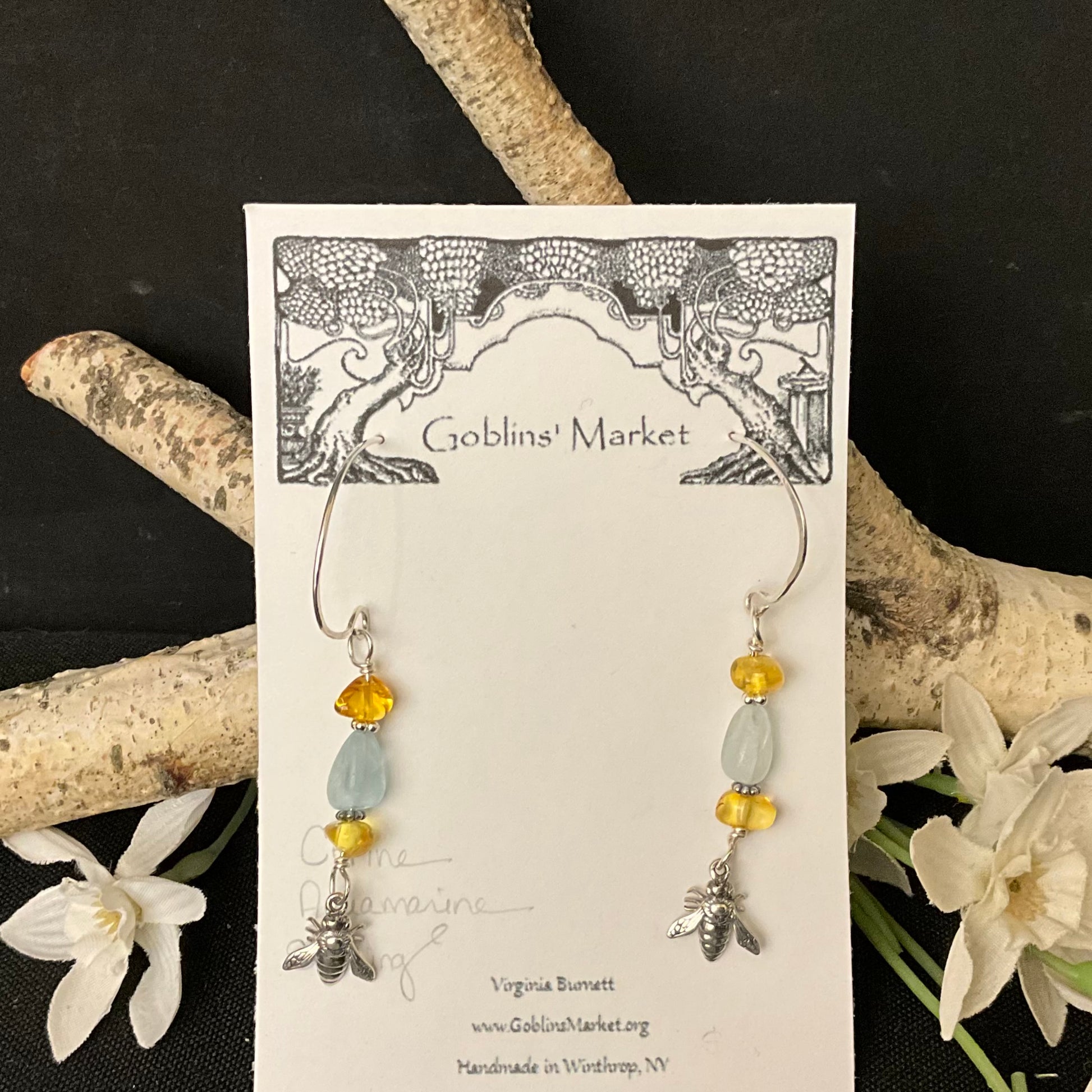 Blue skies & golden honey accompany these tiny sterling silver honeybee charms . Hand forged sterling silver earwires - Virginia's graceful ear wires are designed for comfort, ease of insertion and stability and allow the gemstone dangles to swing freely while minimizing the possibility of loss.