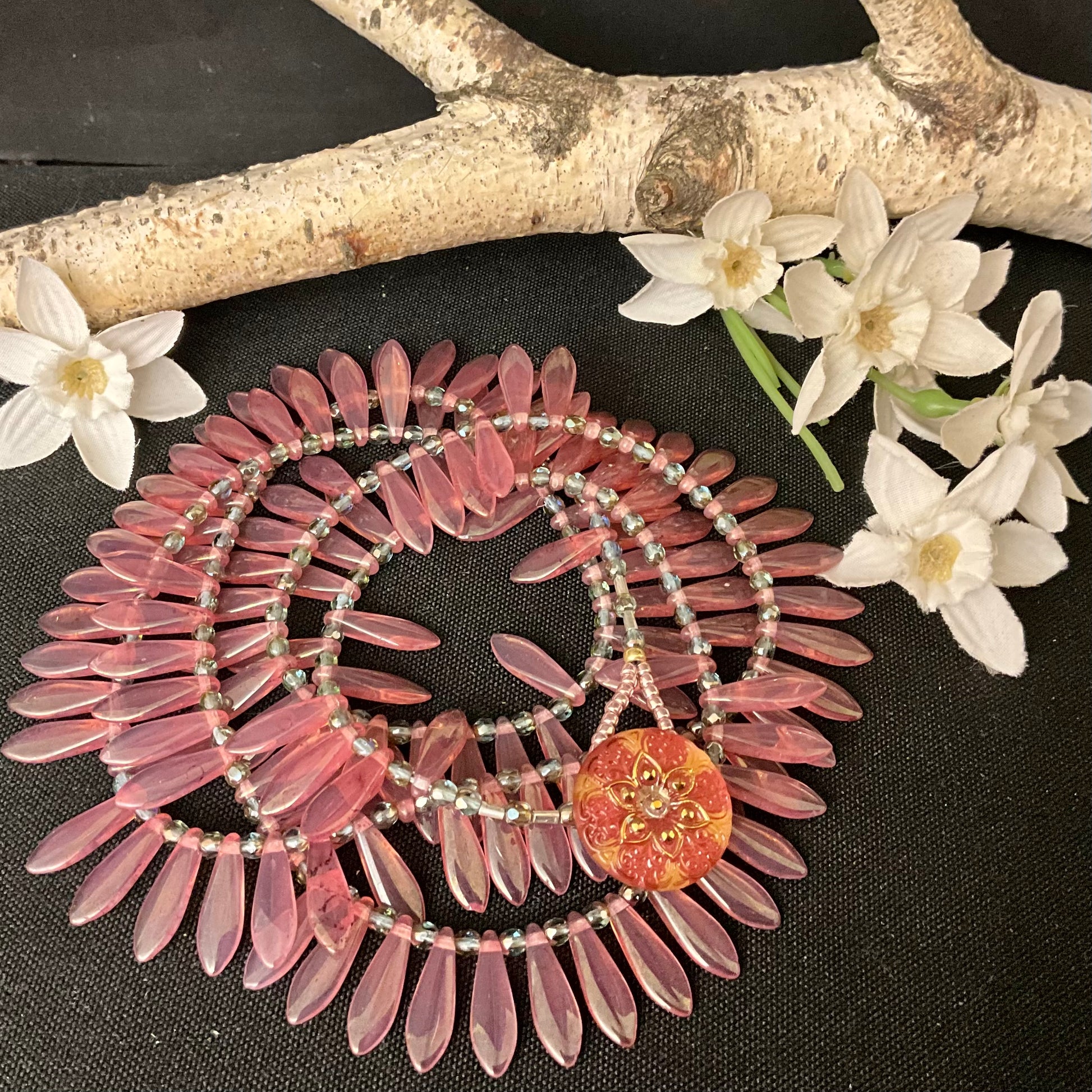 Wrap bracelet / necklace in opaline pink dagger beads with pale blue spacers and large czech glass button clasp