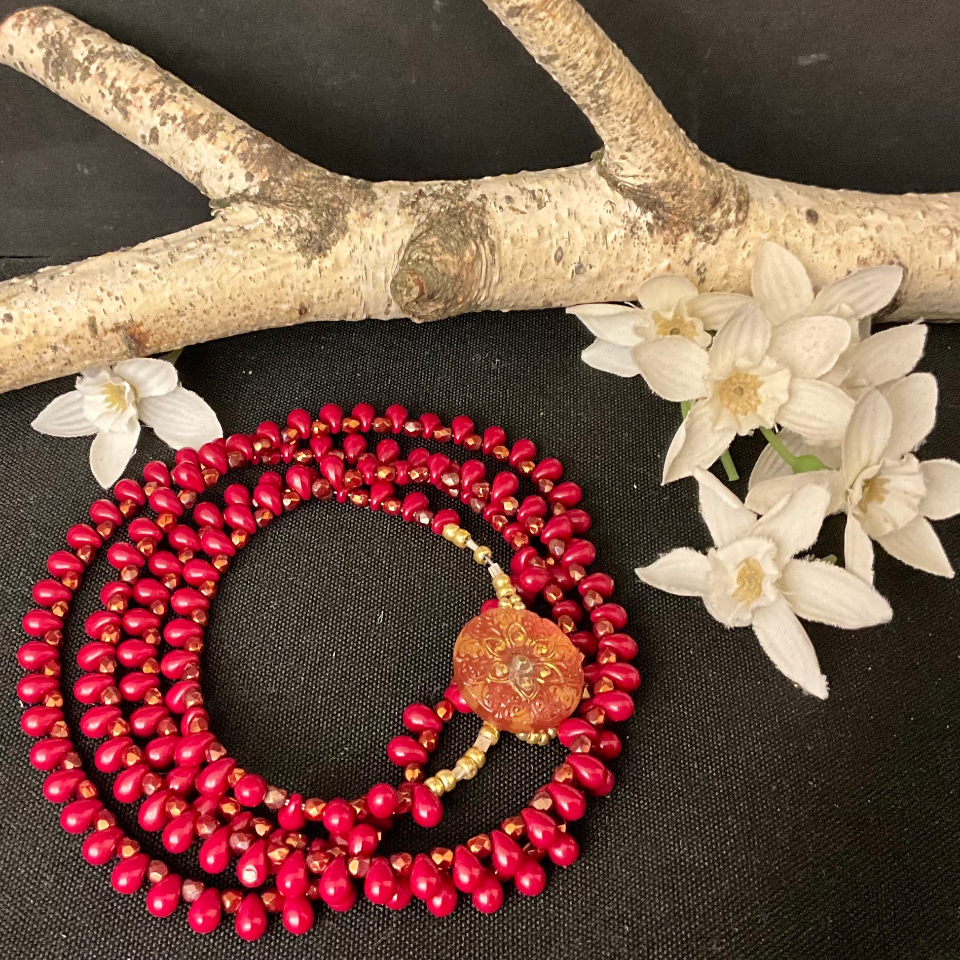 Wrap bracelet / necklace in bright pepper red beads with rust brown spacers and large czech glass button clasp