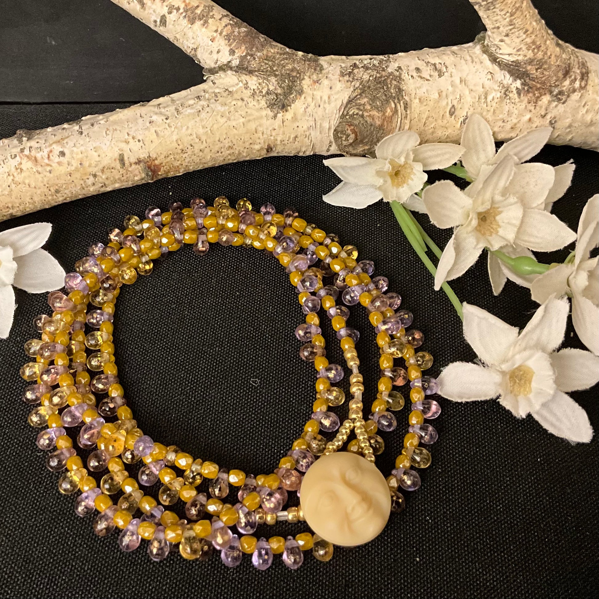 Wrap bracelet / necklace in mix of lilac purple and citrine yellow droplet beads with mustard yellow spacers and large czech glass button clasp